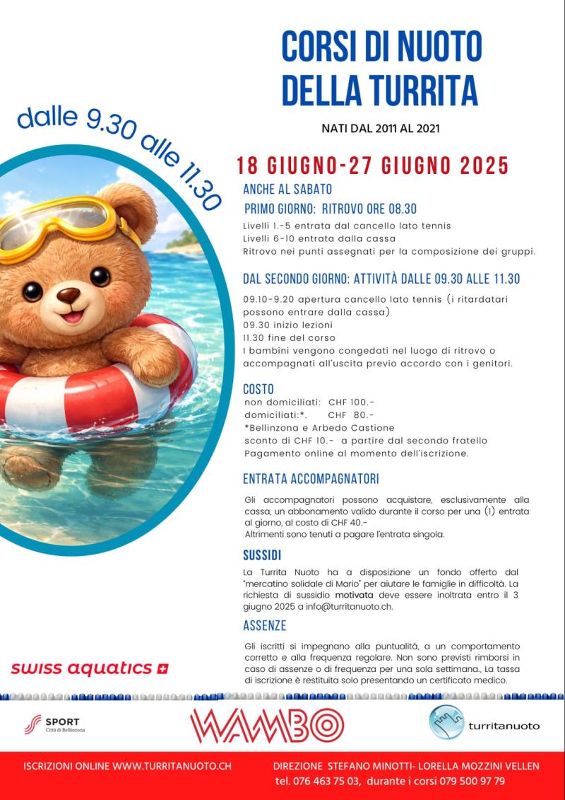 A breve saranno aperte le iscrizione per partecipare ai corsi di nuoto organizzati dalla Turrita Nuoto dal 18 giugno a sabato 27 giugno ( sabati compresi)